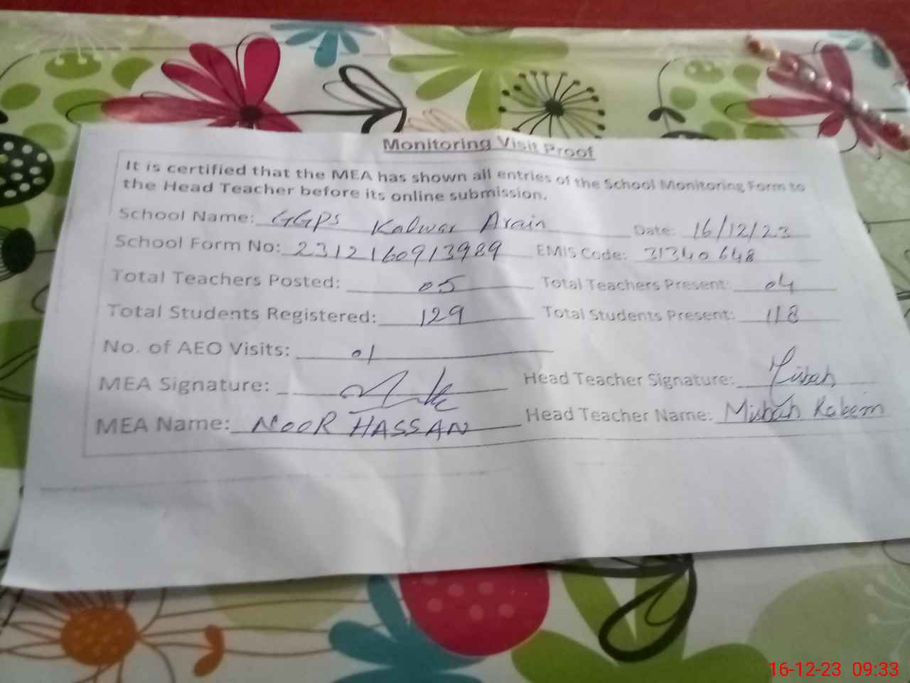 | EMIS Code: 31340648 | Name of School: GGPS KALWARA ARAIN | |||