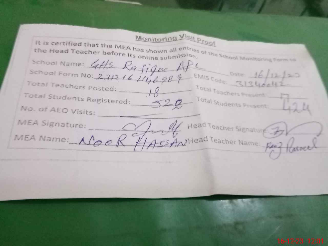 | Attendance Register | Head Teacher | MEA with School | Visit Proof |