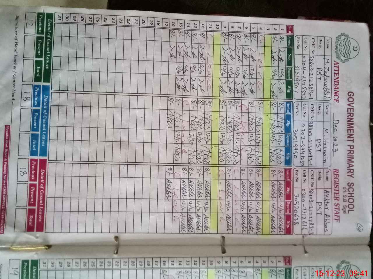 | CNIC | Full Name | Designation | R/C | Absence during last cal. month |
