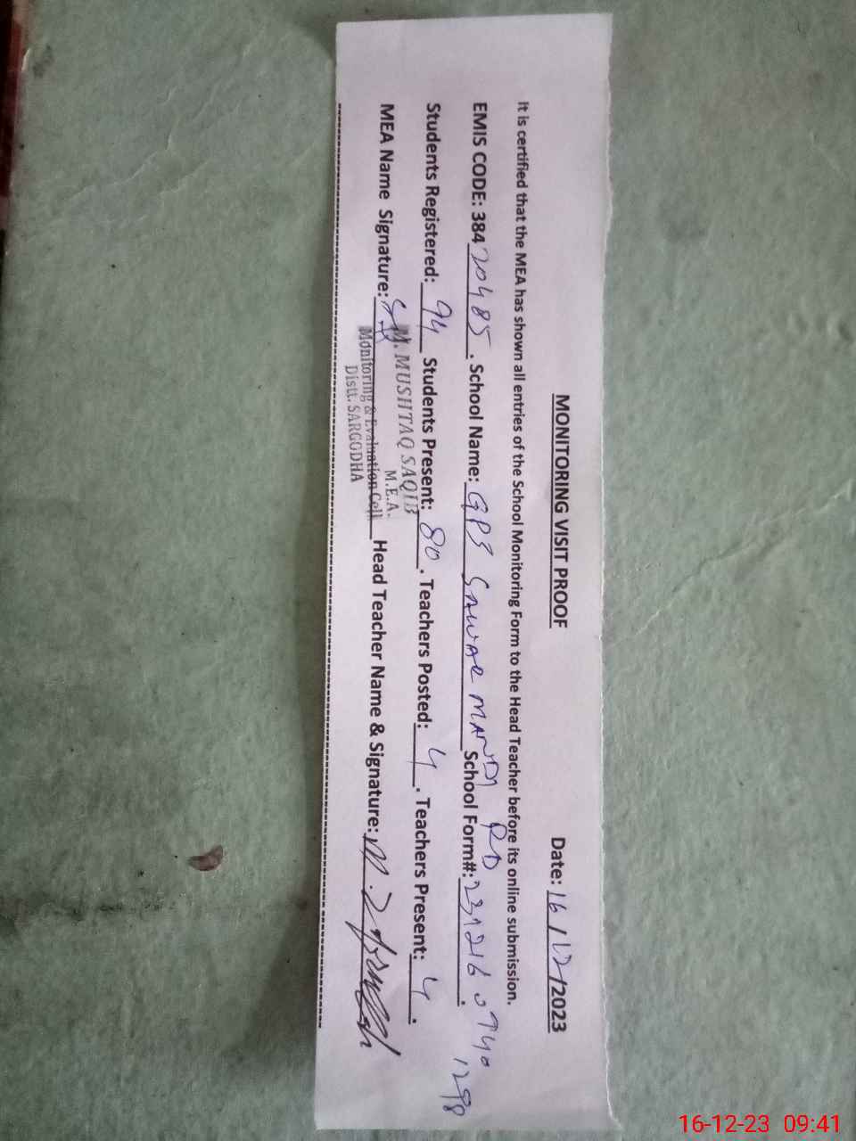 | Attendance Register | Head Teacher | MEA with School | Visit Proof |