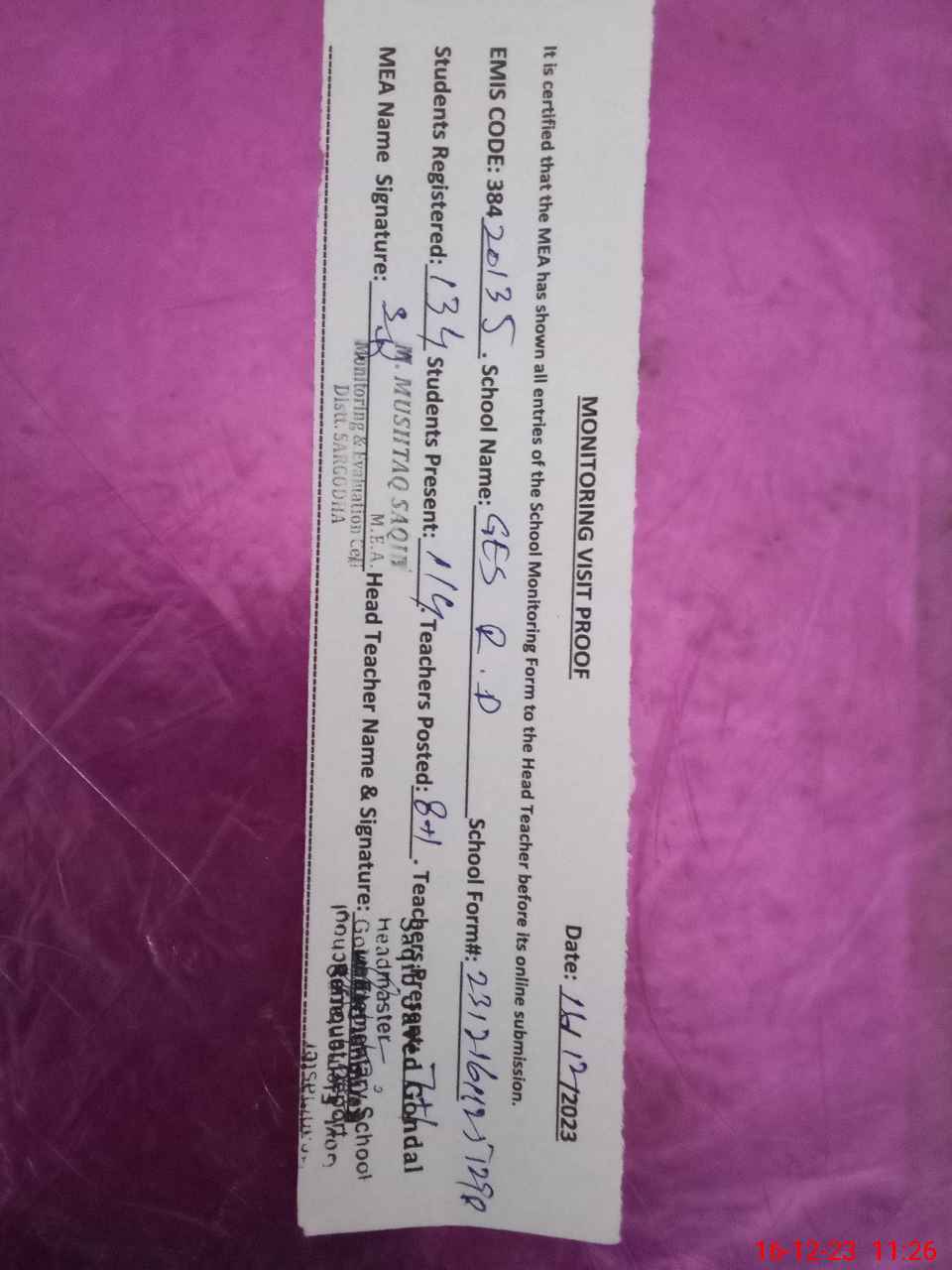 | Attendance Register | Head Teacher | MEA with School | Visit Proof |