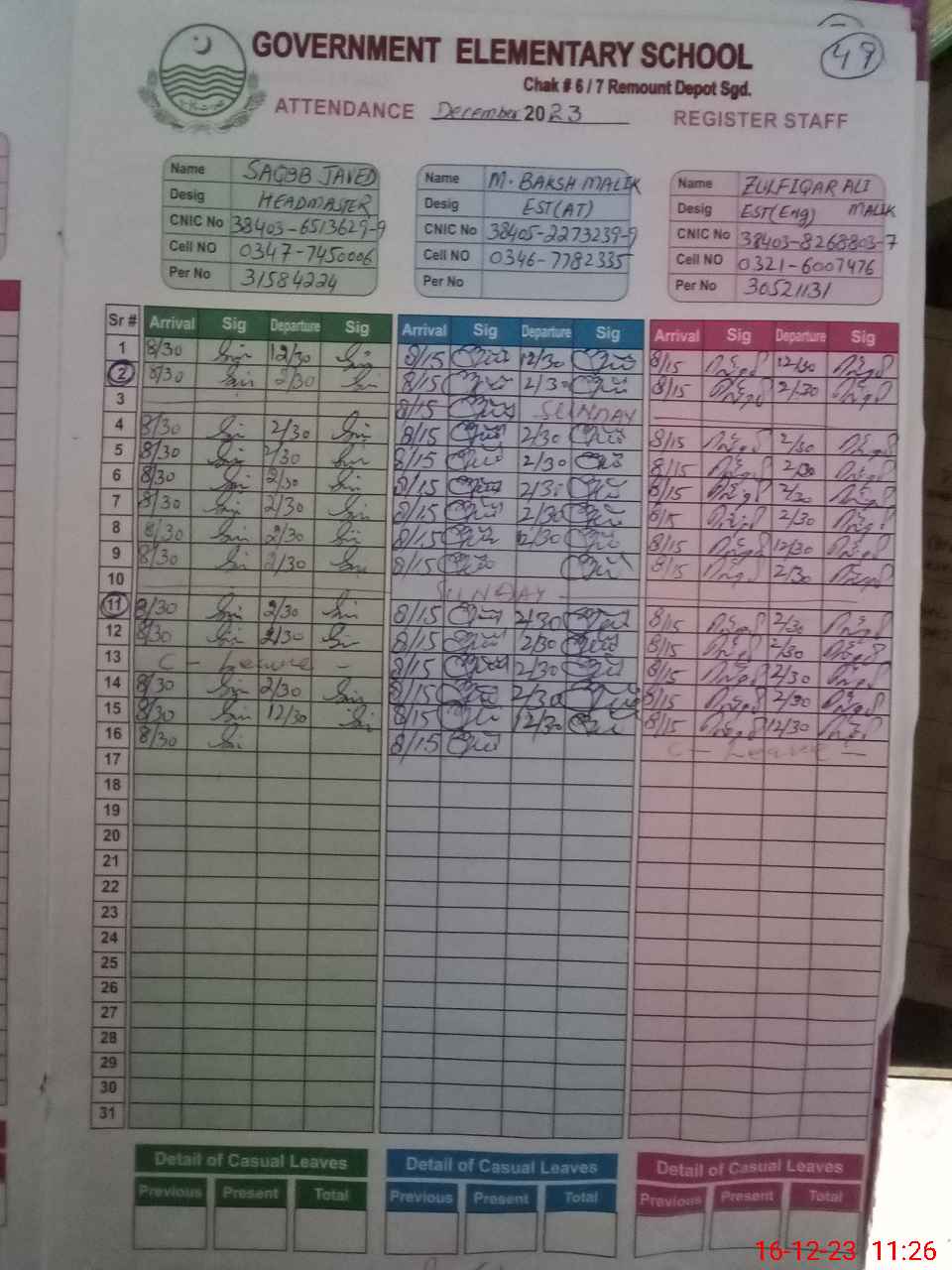 | CNIC | Full Name | Designation | R/C | Absence during last cal. month |