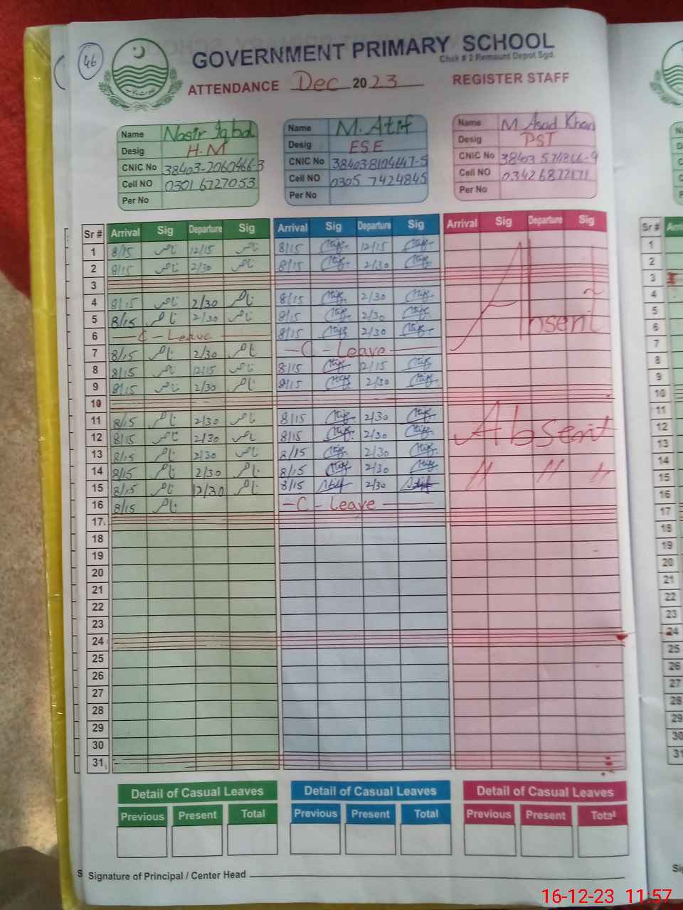 | CNIC | Full Name | Designation | R/C | Absence during last cal. month |