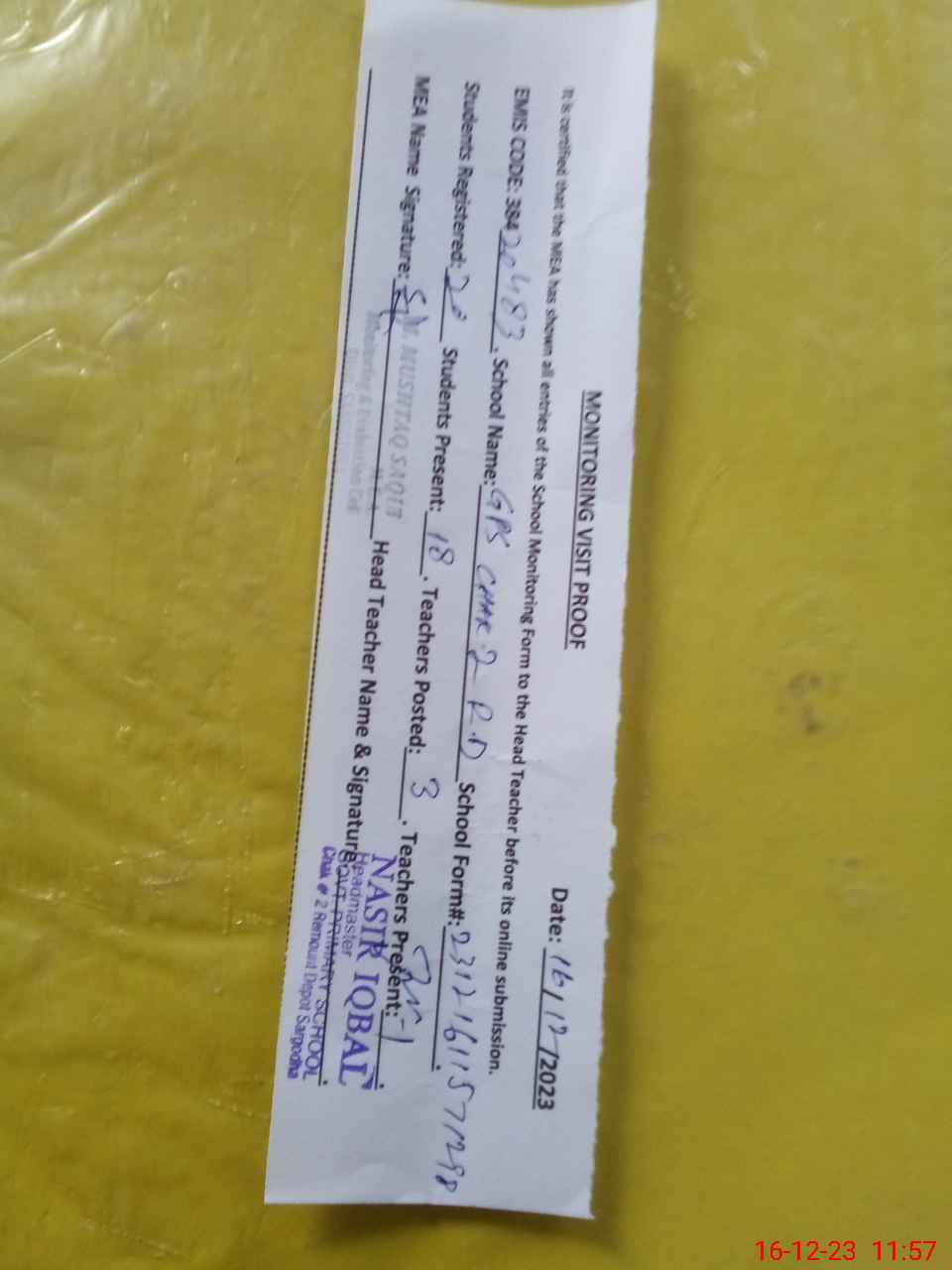 | Attendance Register | Head Teacher | MEA with School | Visit Proof |