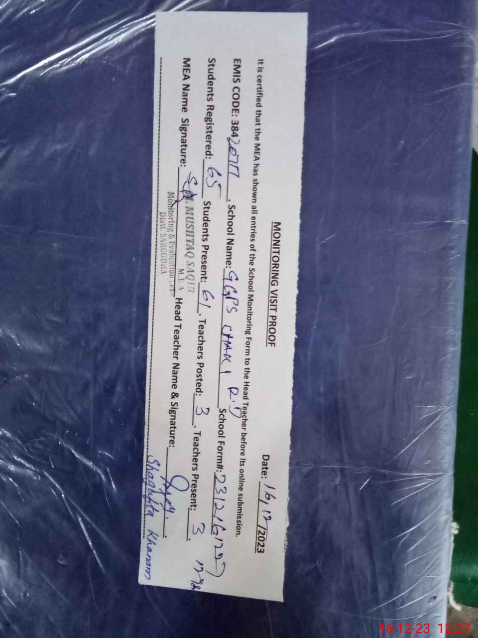 | Attendance Register | Head Teacher | MEA with School | Visit Proof |