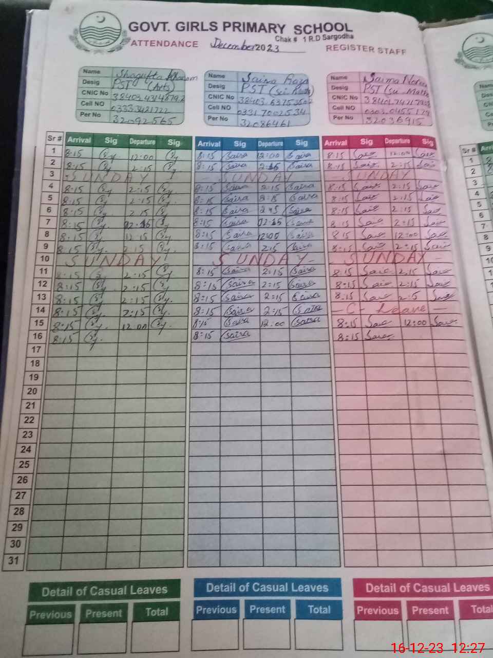 | CNIC | Full Name | Designation | R/C | Absence During Last Calender Month |