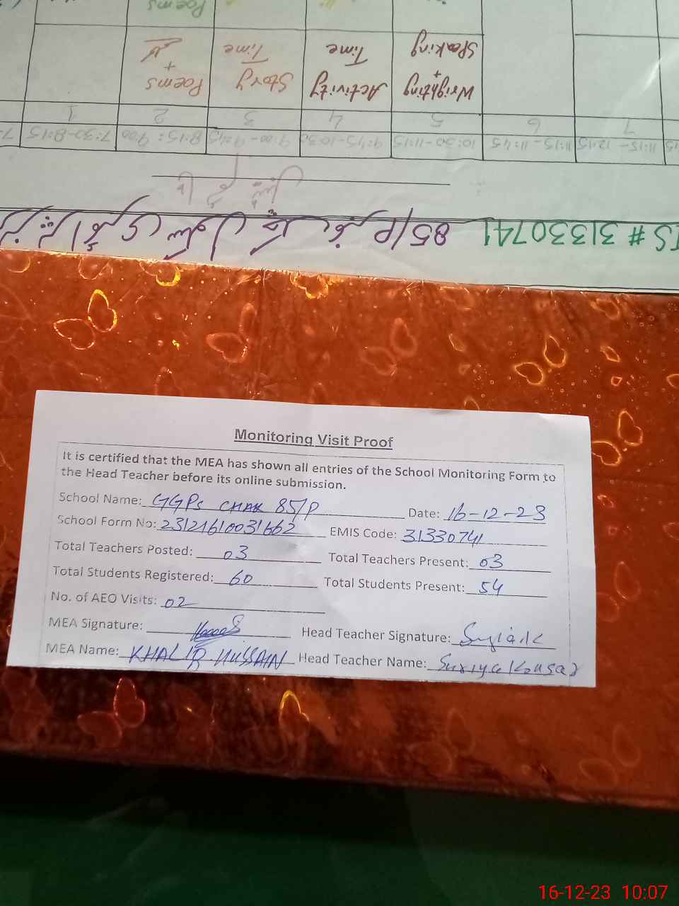 | Attendance Register | Head Teacher | MEA with School | Visit Proof |