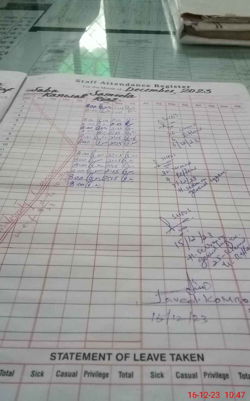 | CNIC | Full Name | Designation | R/C | Absence During Last Calender Month |