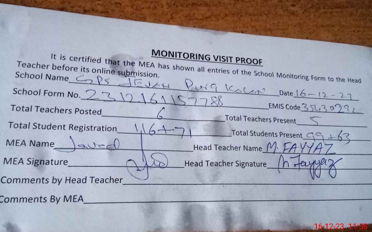 | Attendance Register | Head Teacher | MEA with School | Visit Proof |