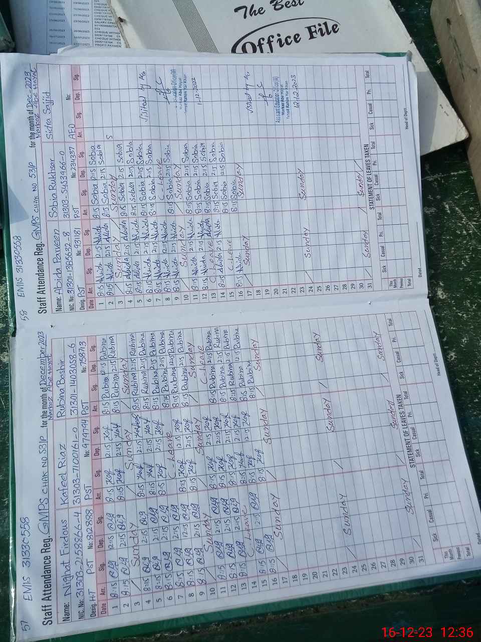 | CNIC | Full Name | Designation | R/C | Absence During Last Calender Month |