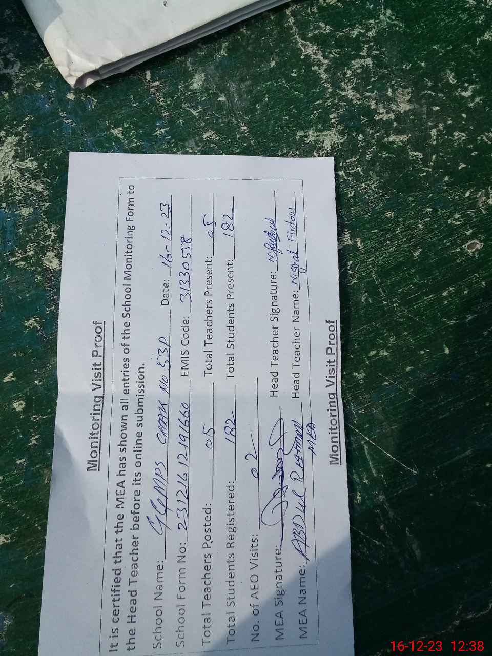 | Attendance Register | Head Teacher | MEA with School | Visit Proof |