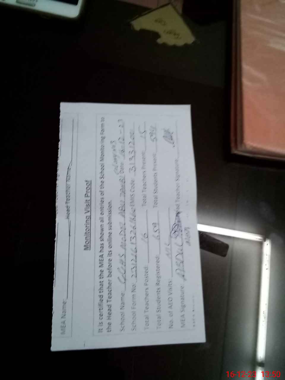 | Attendance Register | Head Teacher | MEA with School | Visit Proof |