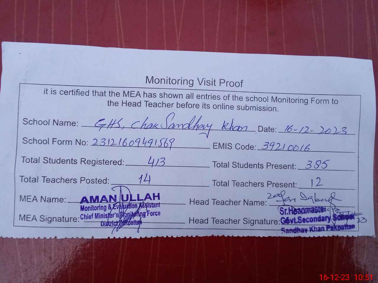 | EMIS Code: 39210016 | Name of School: GHS CHAK SANDHAY KHAN | |||