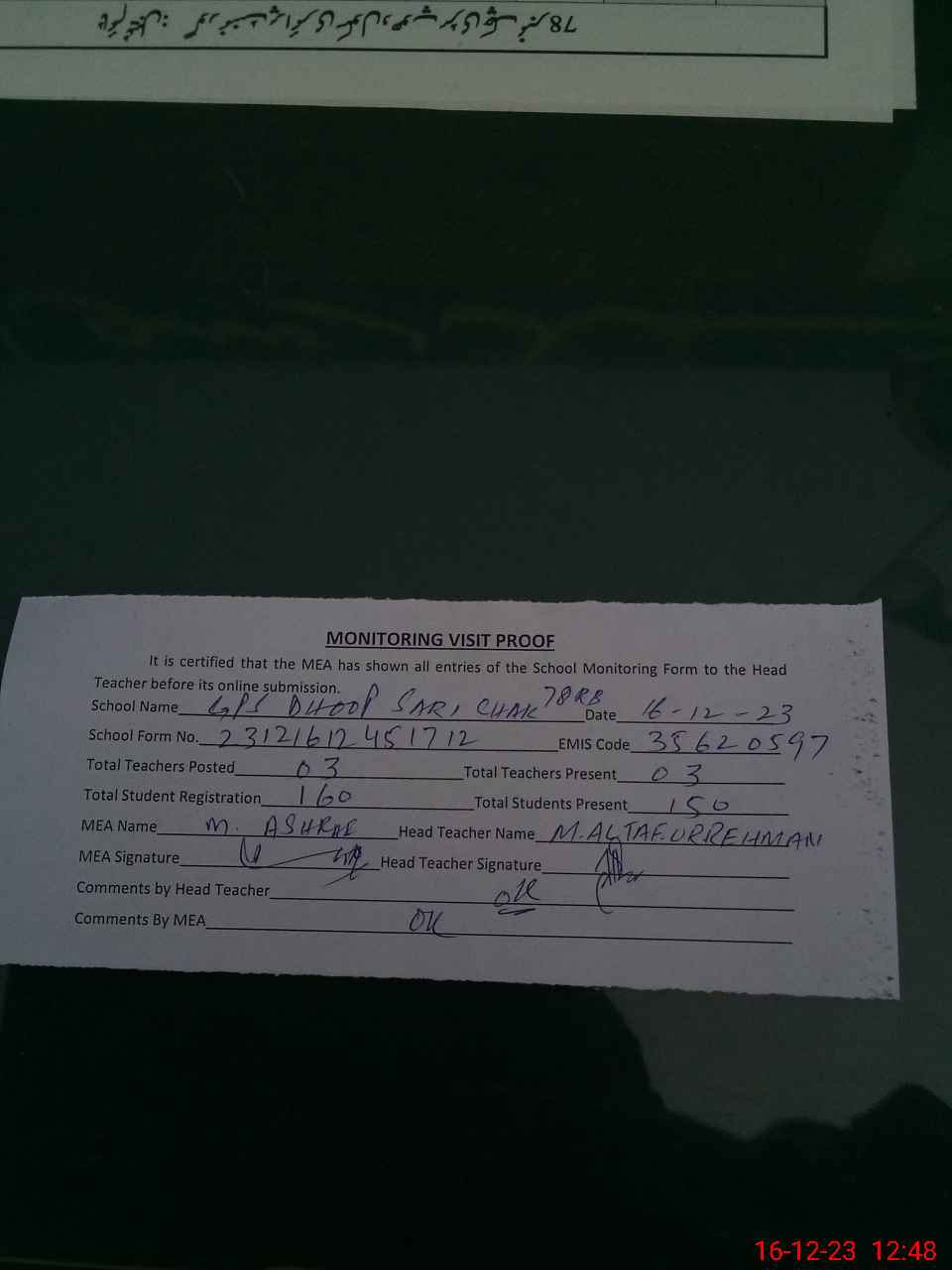 | Attendance Register | Head Teacher | MEA with School | Visit Proof |
