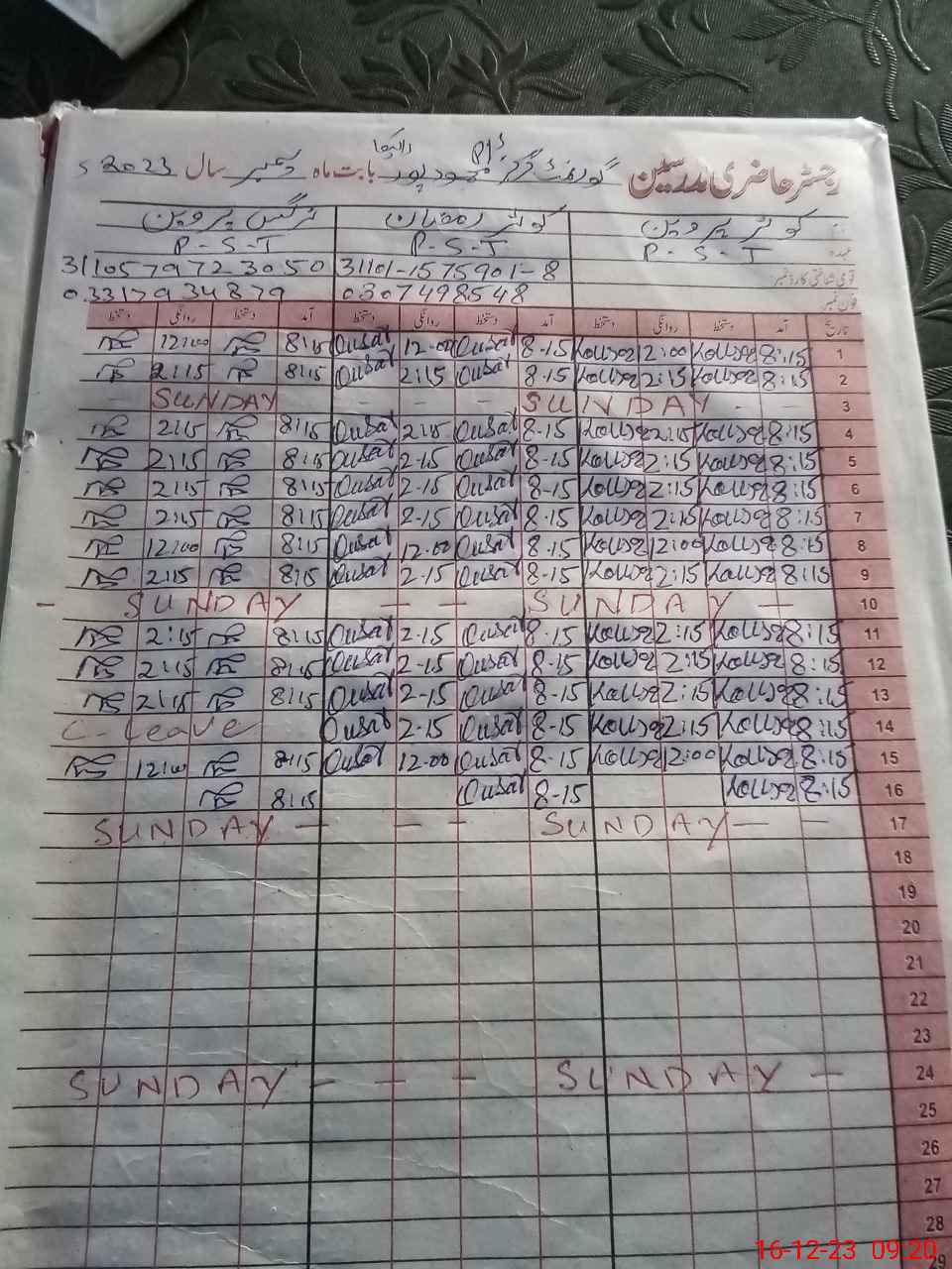 | CNIC | Full Name | Designation | R/C | Absence During Last Calender Month |