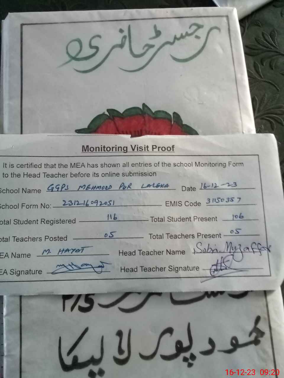 | Attendance Register | Head Teacher | MEA with School | Visit Proof |