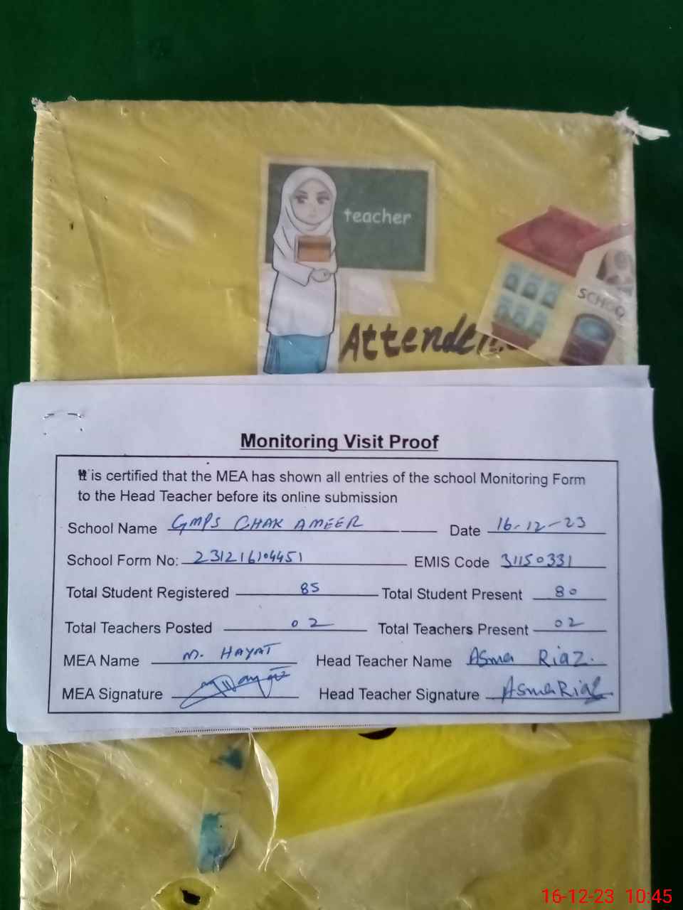 | Attendance Register | Head Teacher | MEA with School | Visit Proof |