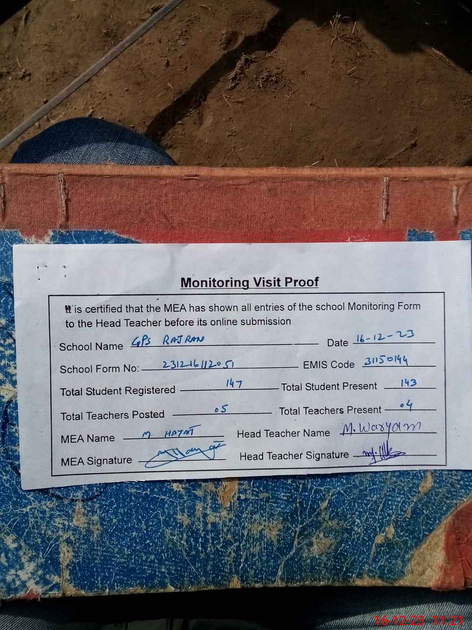 | Attendance Register | Head Teacher | MEA with School | Visit Proof |