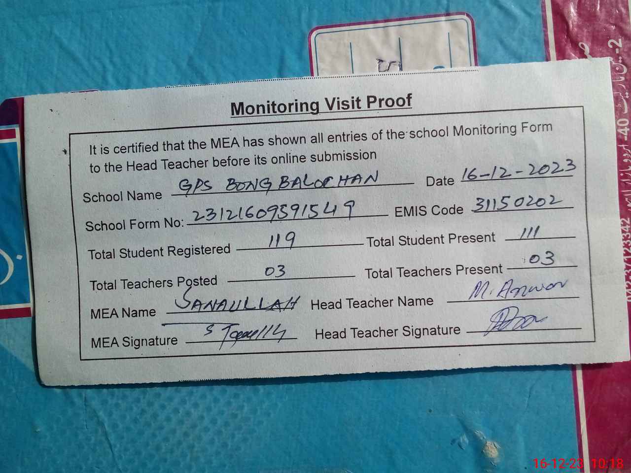 | EMIS Code: 31150202 | Name of School: GPS BONGA BALOCHAN | |||
