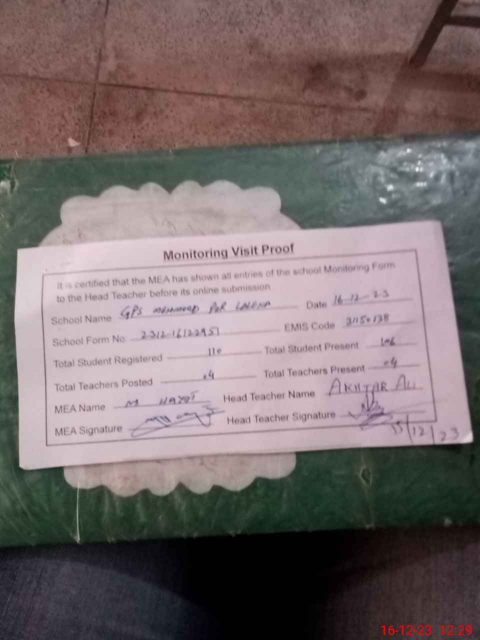 | Attendance Register | Head Teacher | MEA with School | Visit Proof |
