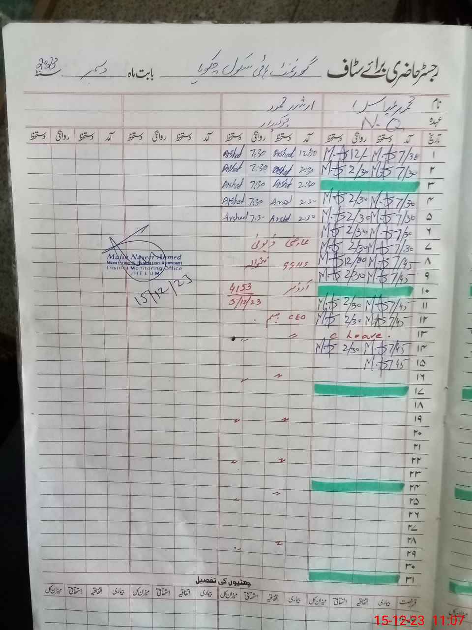 | CNIC | Full Name | Designation | R/C | Absence During Last Calender Month |