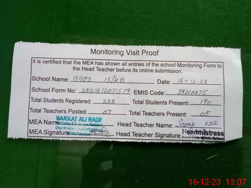 | Certified that this School was Inspected by the Undersigned MEA/DMO Today and the Information Stated Above is as Per Record. | |||||