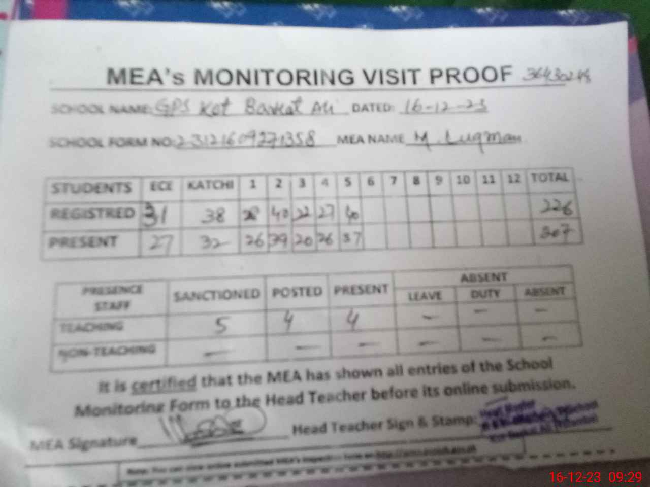 | EMIS Code: 36430244 | Name of School: GPS KOT BARKAT ALI, TULAMBA | |||