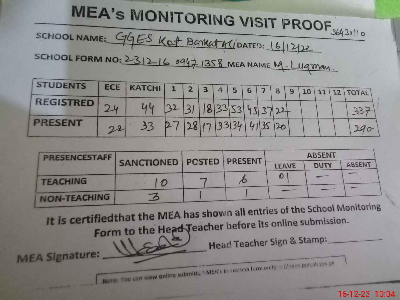 | Attendance Register | Head Teacher | MEA with School | Visit Proof |
