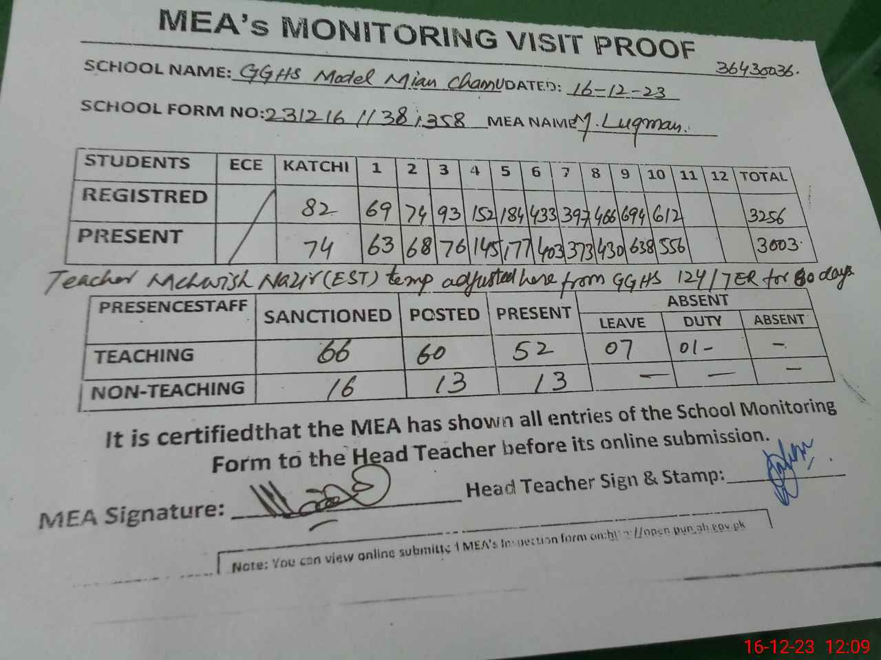 | EMIS Code: 36430036 | Name of School: GGHS MODEL MIAN CHANNU | |||