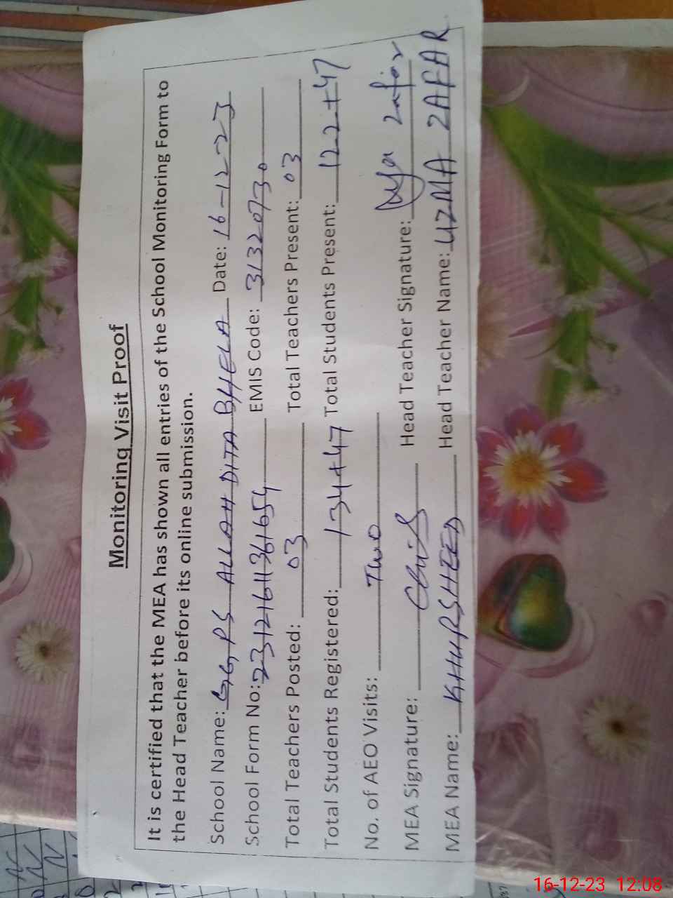 | Attendance Register | Head Teacher | MEA with School | Visit Proof |