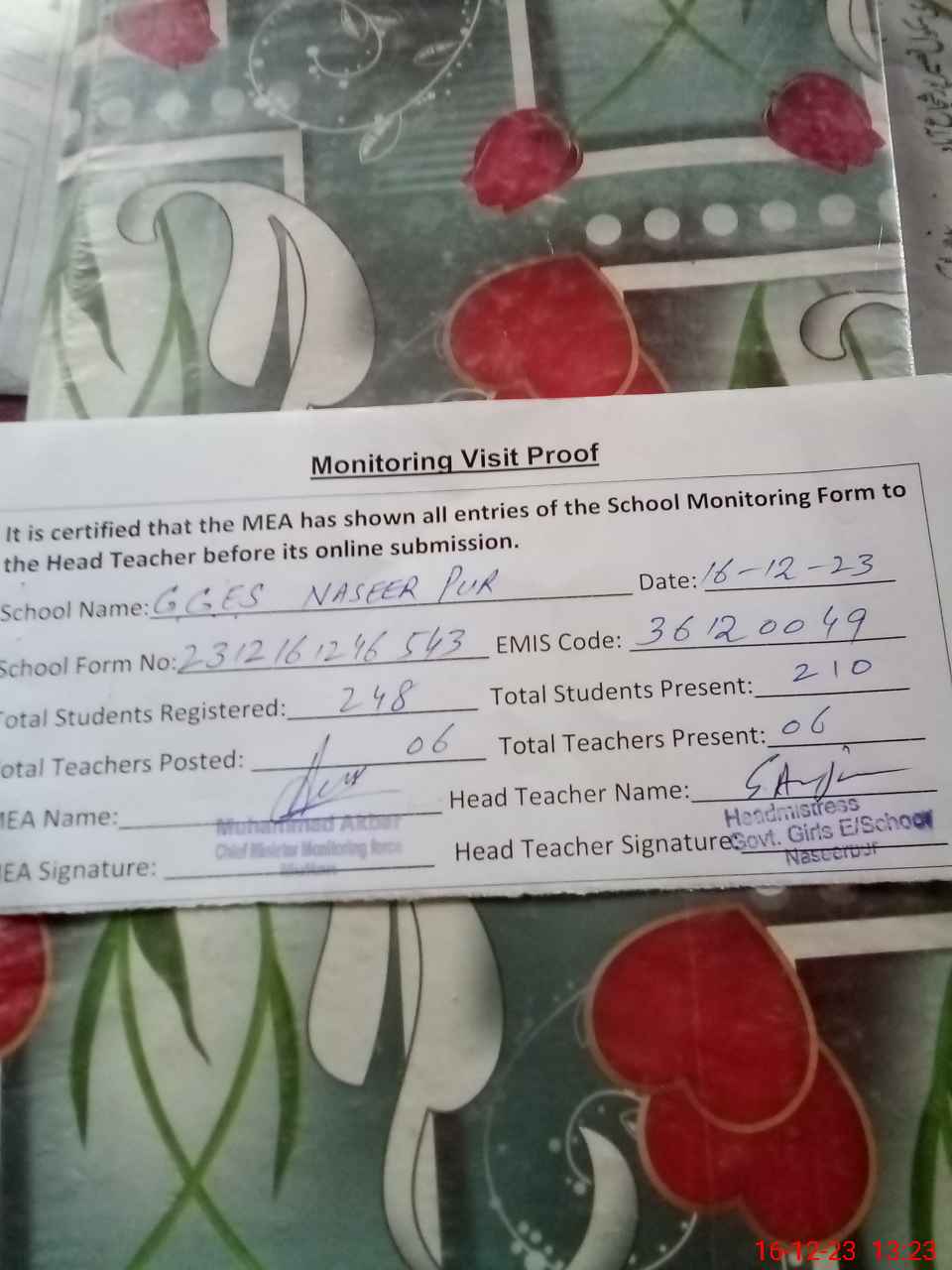 | Attendance Register | Head Teacher | MEA with School | Visit Proof |