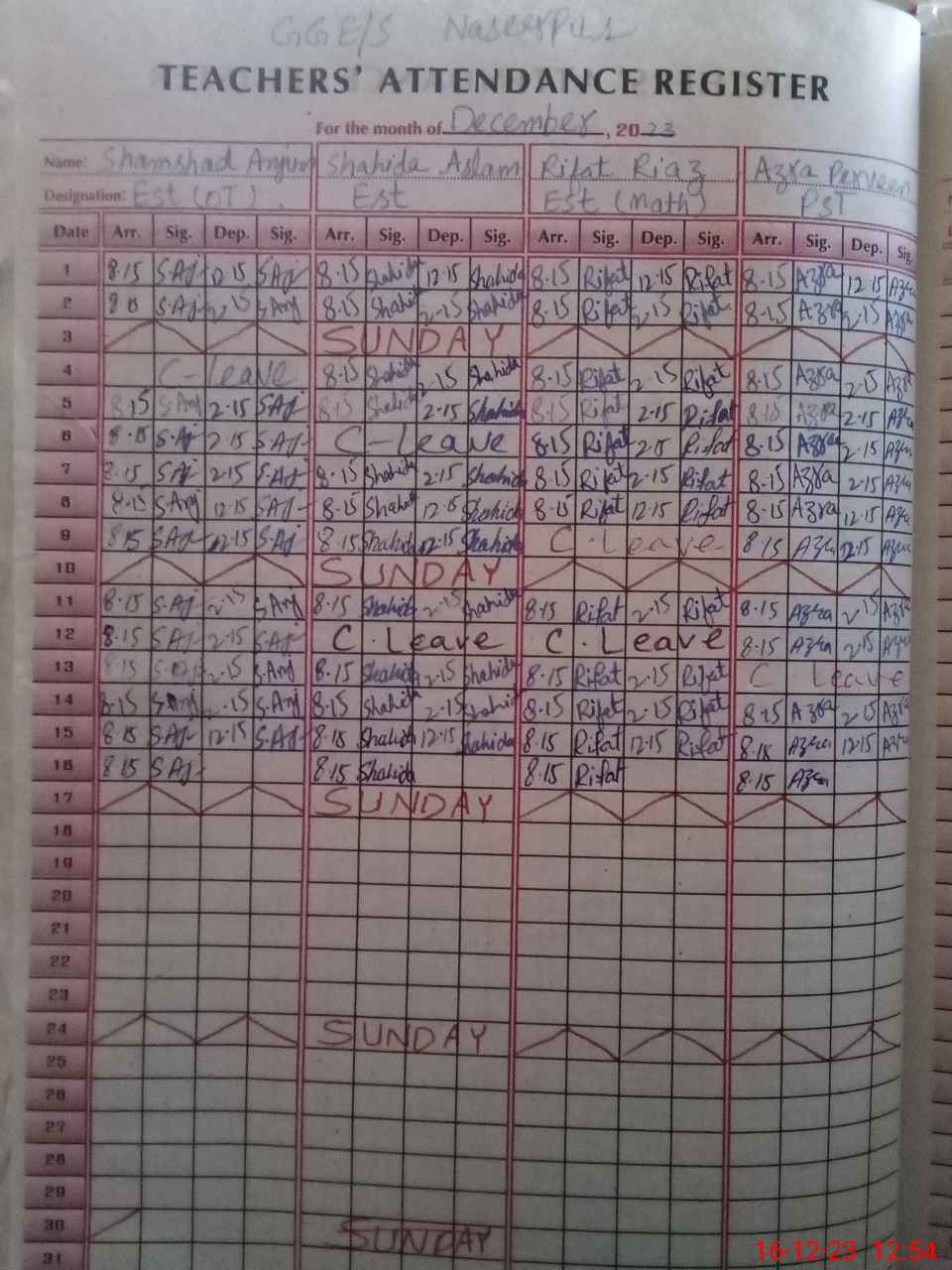 | CNIC | Full Name | Designation | R/C | Absence During Last Calender Month |