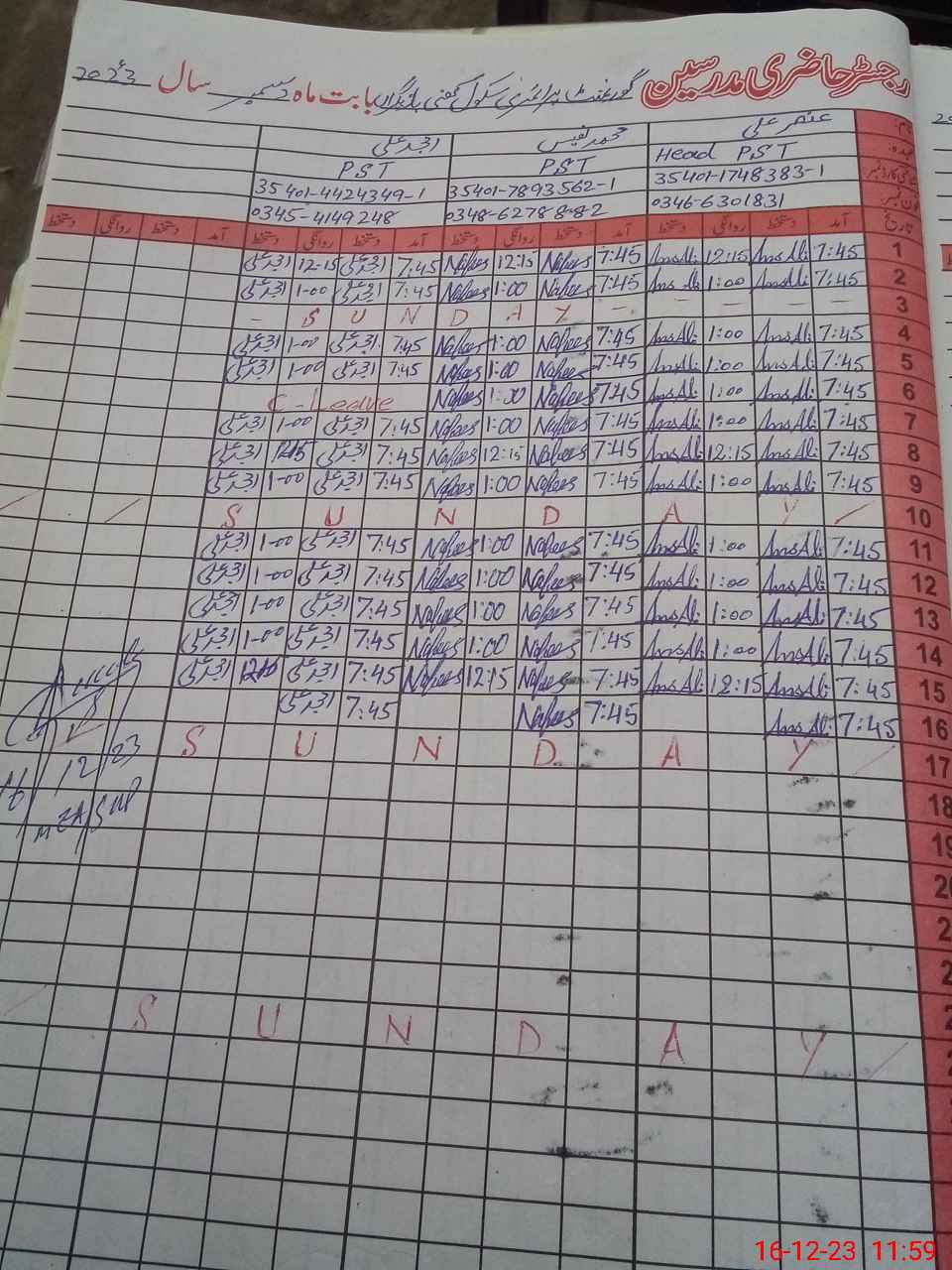 | CNIC | Full Name | Designation | R/C | Absence During Last Calender Month |