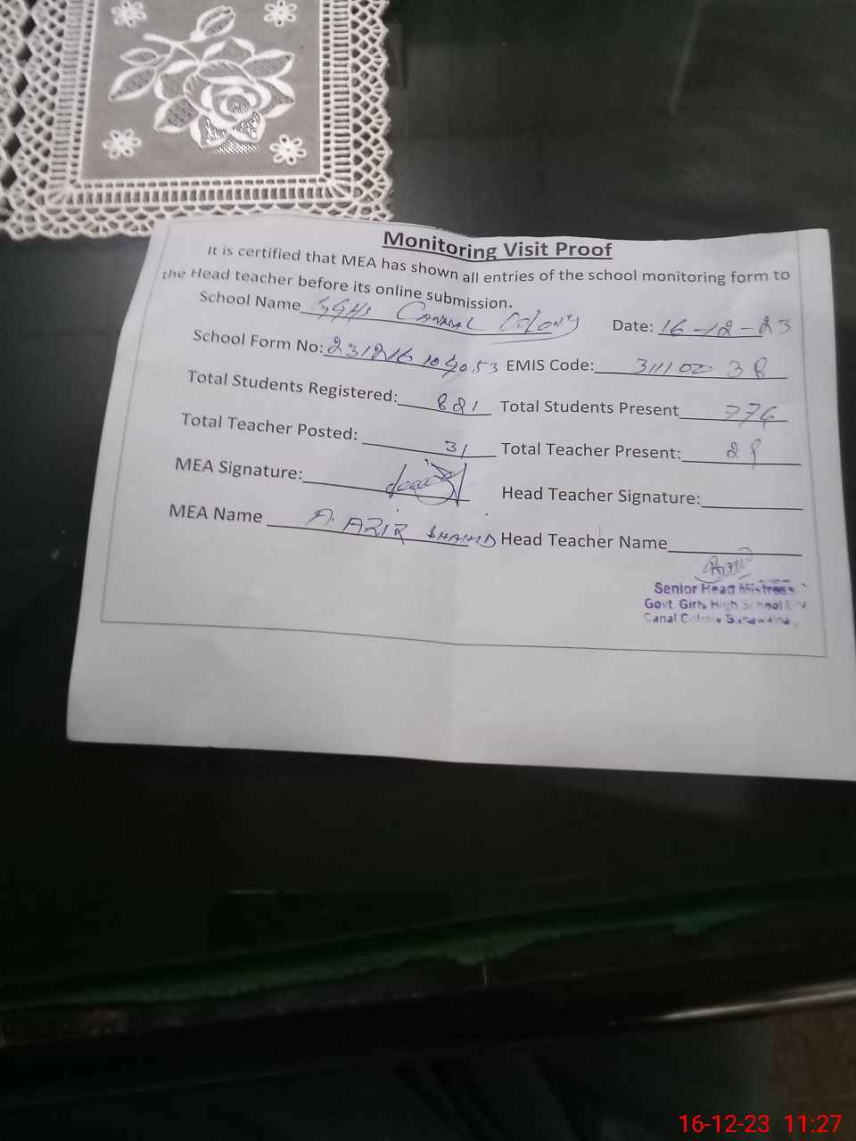 | Attendance Register | Head Teacher | MEA with School | Visit Proof |