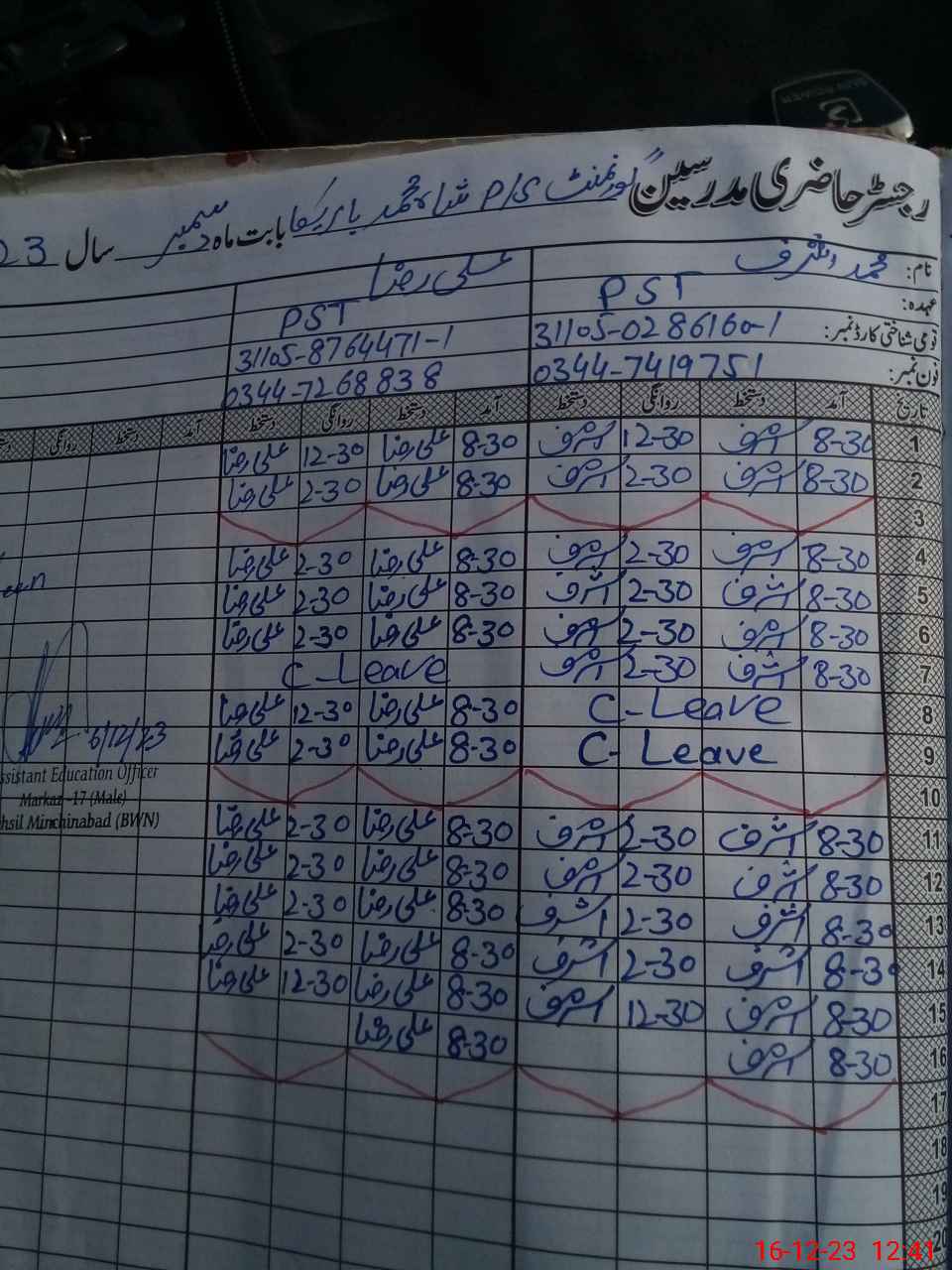 | Name: MU**** AS**** Designation: (School Headmaster's/Headmistress's) PST Phone/Cell Number: 03**** |