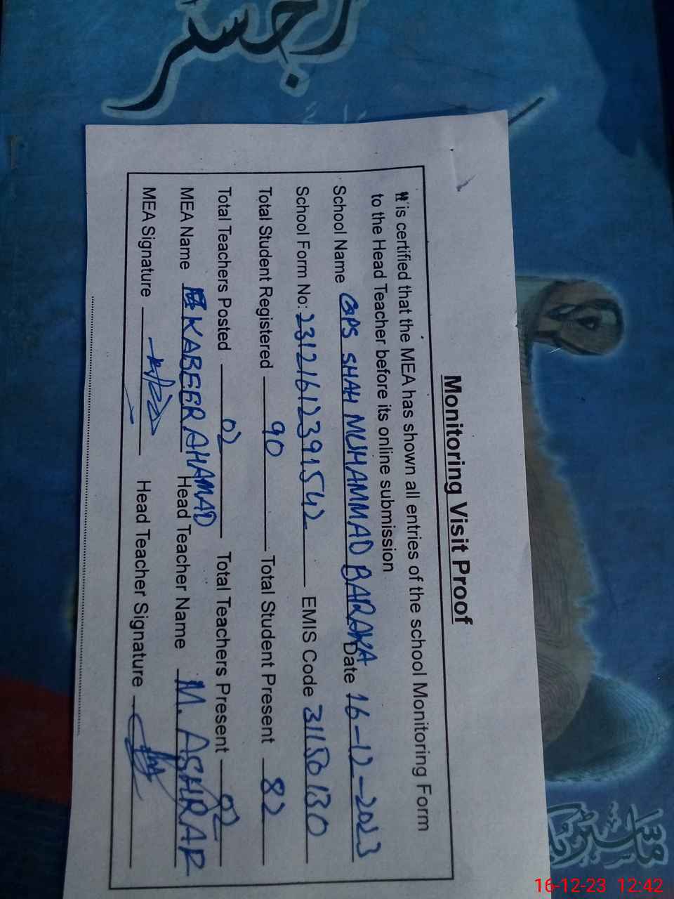 | Attendance Register | Head Teacher | MEA with School | Visit Proof |