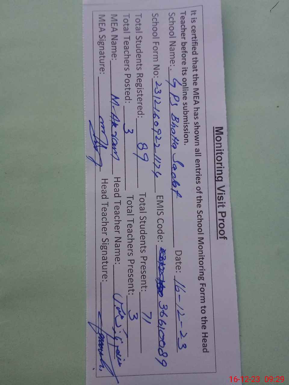 | Attendance Register | Head Teacher | MEA with School | Visit Proof |