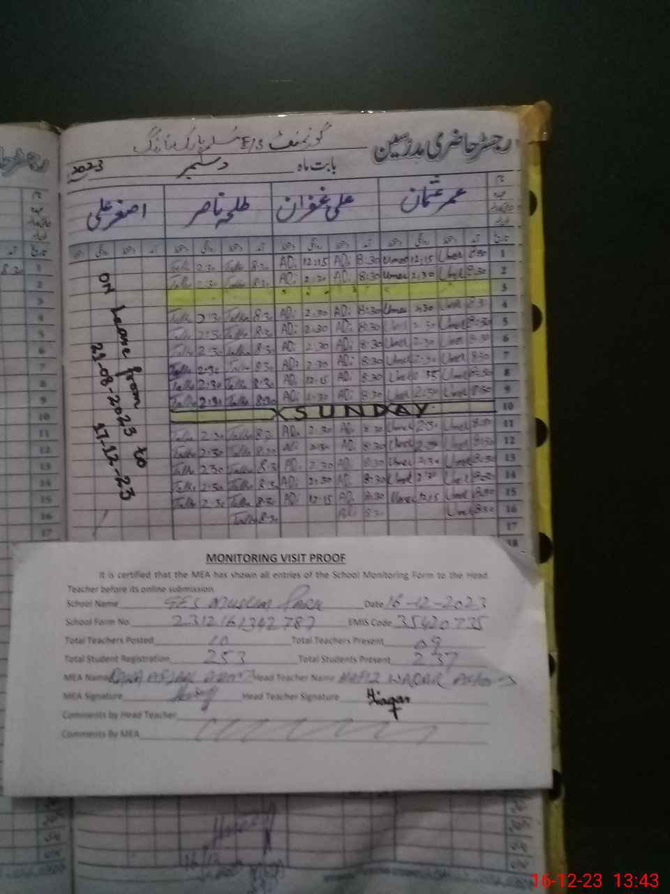 | Attendance Register | Head Teacher | MEA with School | Visit Proof |