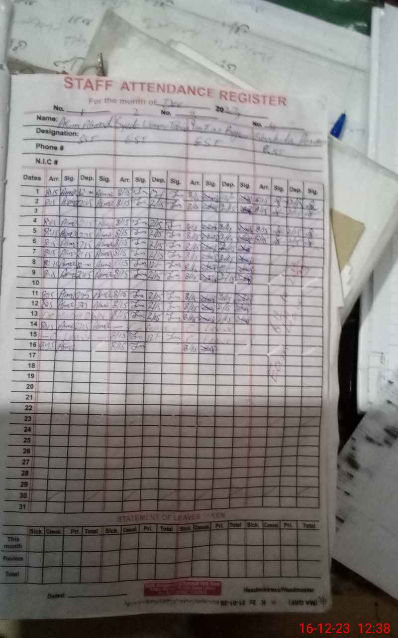 | CNIC | Full Name | Designation | R/C | Absence During Last Calender Month |