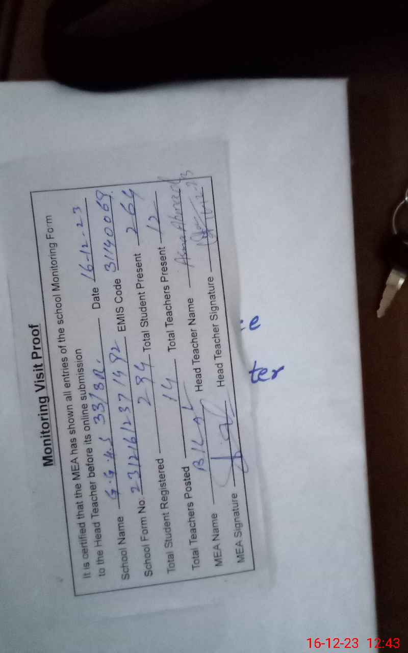 | Attendance Register | Head Teacher | MEA with School | Visit Proof |