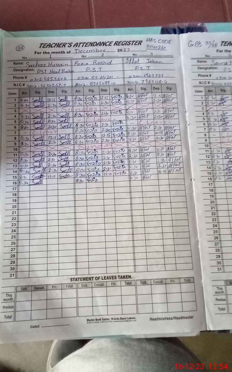 | CNIC | Full Name | Designation | R/C | Absence During Last Calender Month |