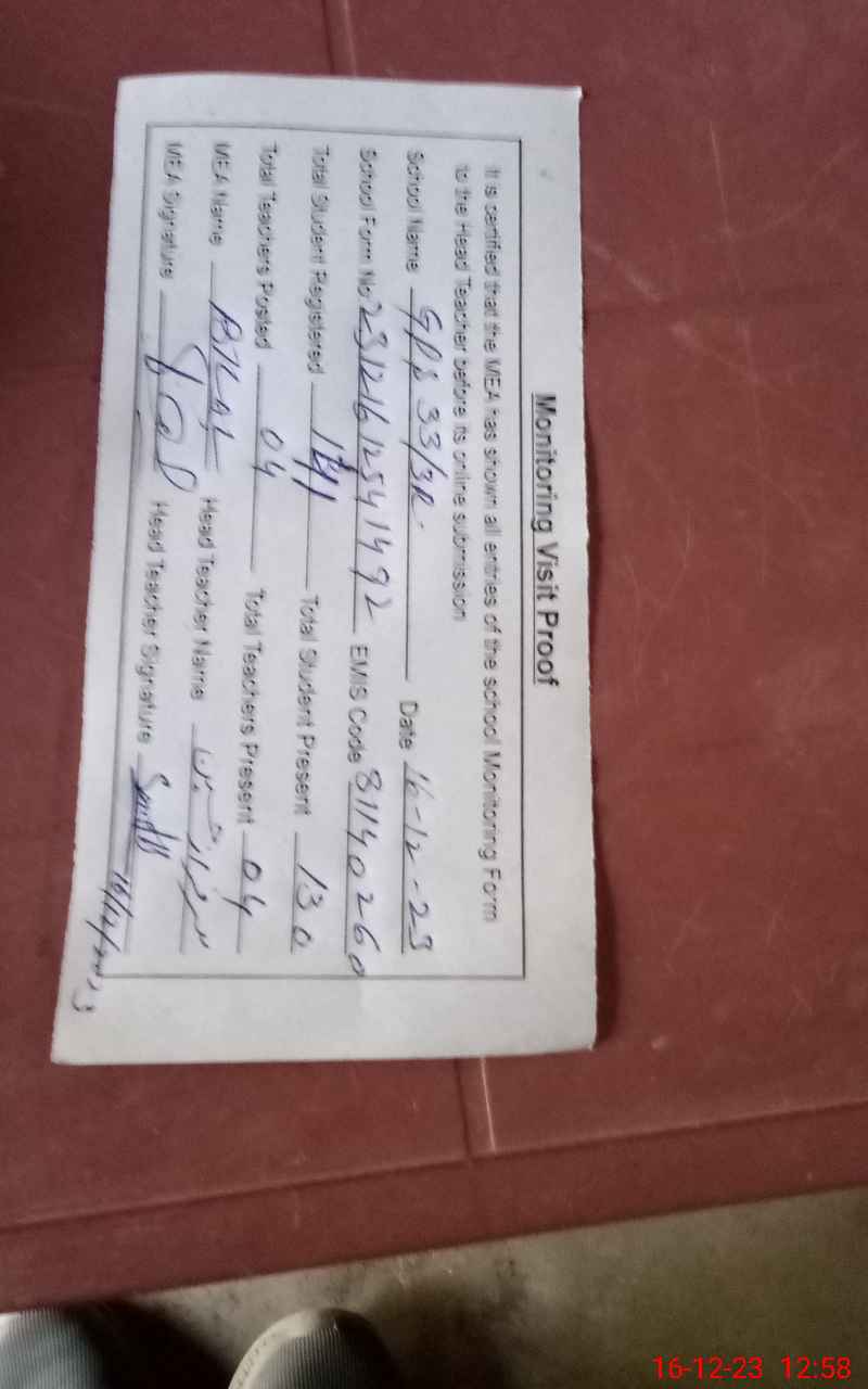 | Attendance Register | Head Teacher | MEA with School | Visit Proof |