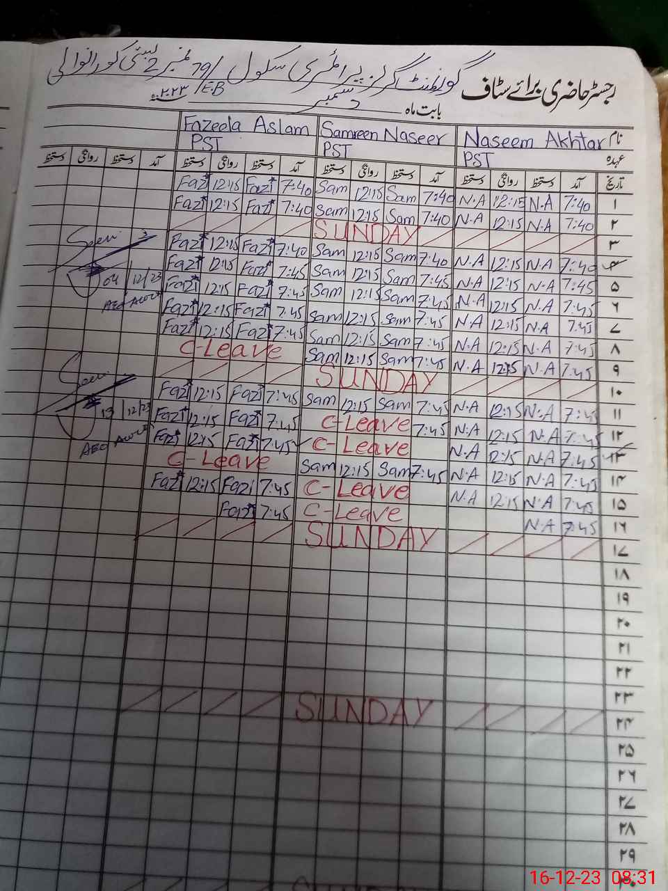 | CNIC | Full Name | Designation | R/C | Absence During Last Calender Month |