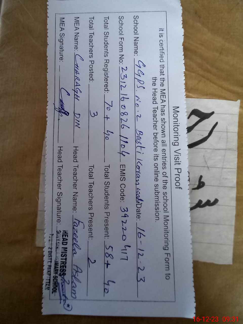 | Attendance Register | Head Teacher | MEA with School | Visit Proof |