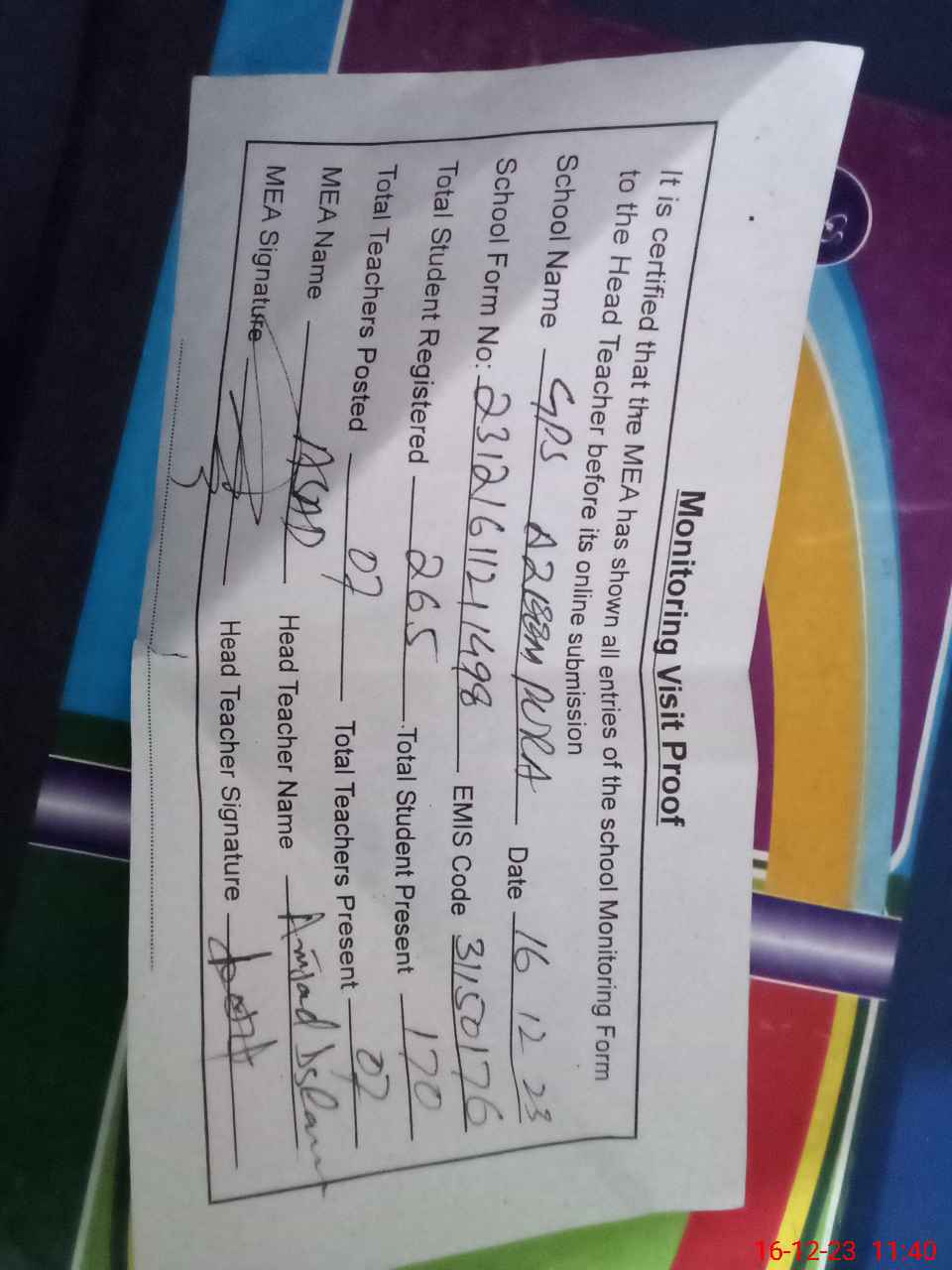 | EMIS Code: 31150176 | Name of School: GPS AZEEM PURA | |||