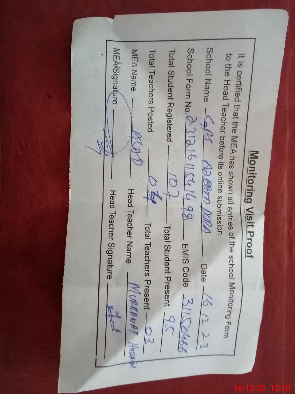 | Attendance Register | Head Teacher | MEA with School | Visit Proof |