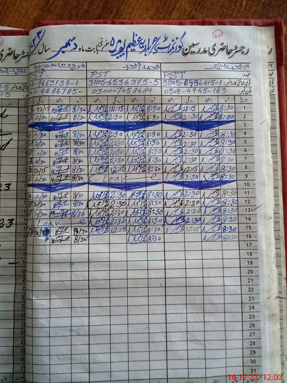 | CNIC | Full Name | Designation | R/C | Absence During Last Calender Month |