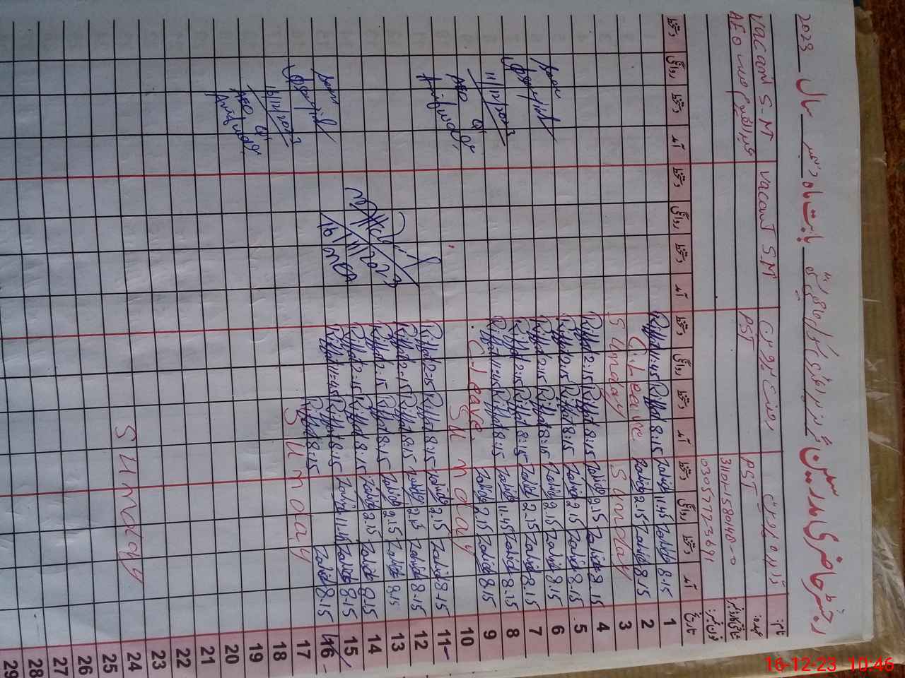 | CNIC | Full Name | Designation | R/C | Absence During Last Calender Month |