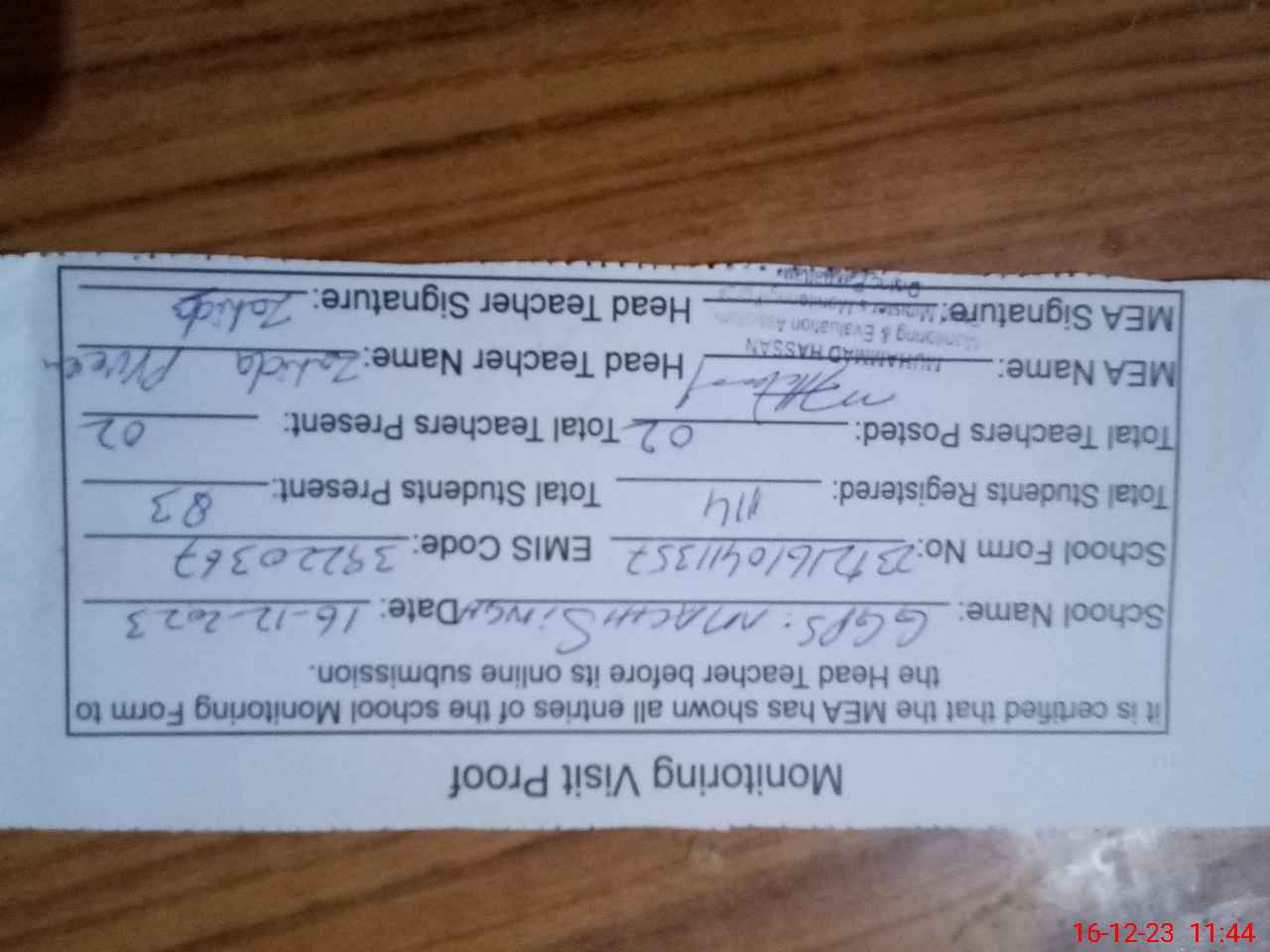 | Attendance Register | Head Teacher | MEA with School | Visit Proof |