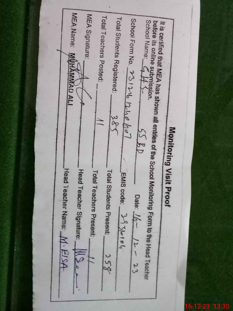 | Attendance Register | Head Teacher | MEA with School | Visit Proof |